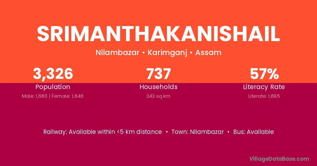 Srimanthakanishail village has a total population of 3,326 people, of which 1,680 are males and 1,646 are females.