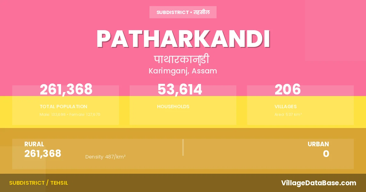 According to the 2011 census The total area of Patharkandi Subdivision is 537 km², with a population of 261368 people. The population density is 487 inhabitants per square kilometre, and there are approximately 53614 houses in the sub district.