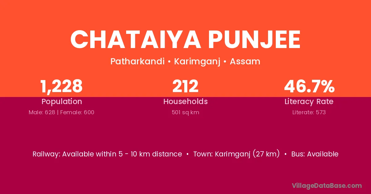 Karimganj (27 km) is the nearest town to Chataiya Punjee village for major economic activities and is located approximately 27 km away.