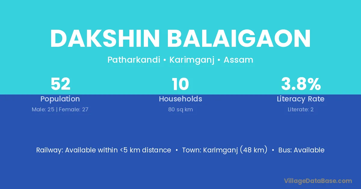 Dakshin Balaigaon village has a total population of 52 people, of which 25 are males and 27 are females.