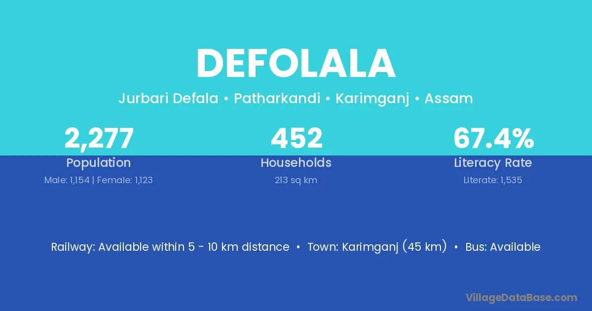 Karimganj (45 km) is the nearest town to Defolala village for major economic activities and is located approximately 45 km away.