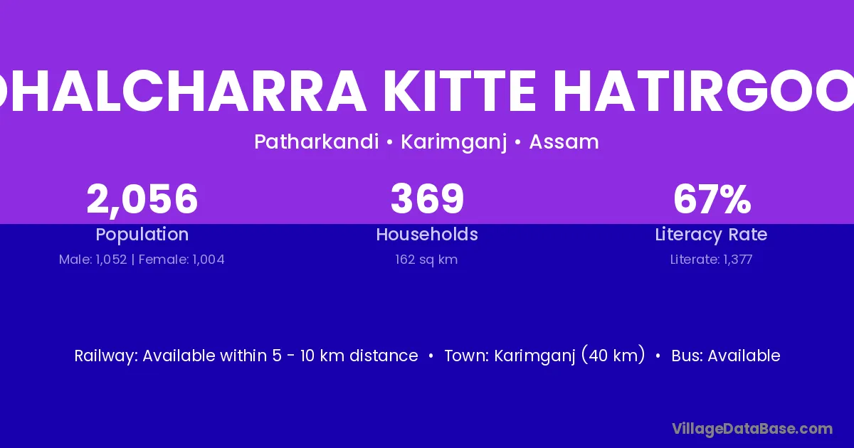Karimganj (40 km) is the nearest town to Dhalcharra Kitte Hatirgool village for major economic activities and is located approximately 40 km away.