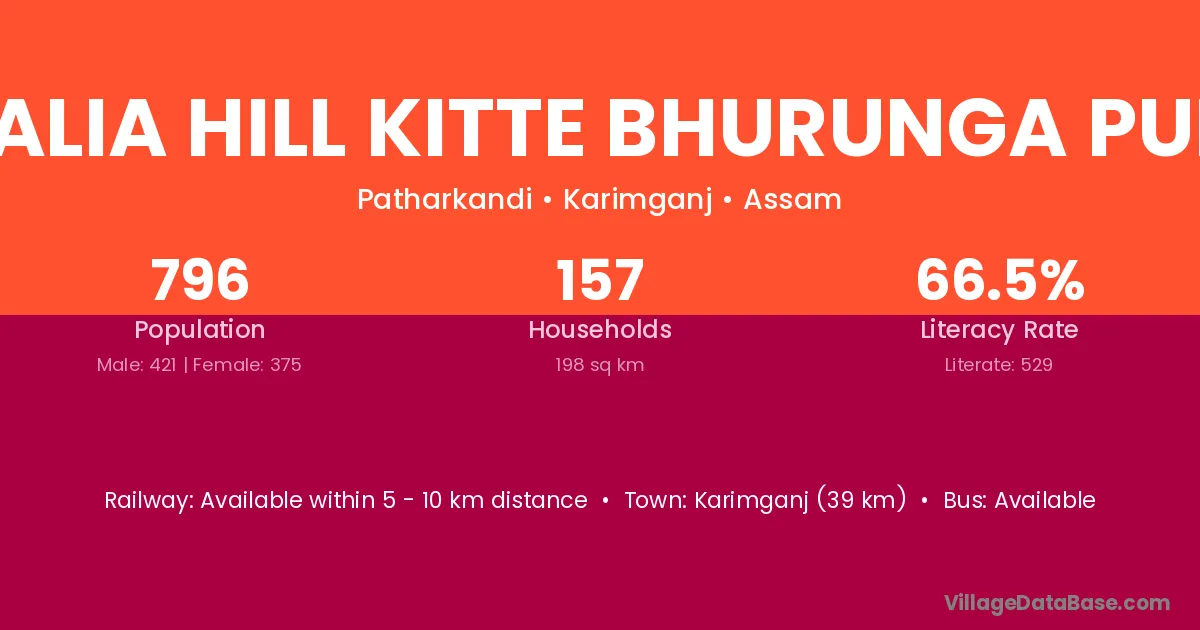 Karimganj (39 km) is the nearest town to Duhalia Hill Kitte Bhurunga Punjee village for major economic activities and is located approximately 39 km away.