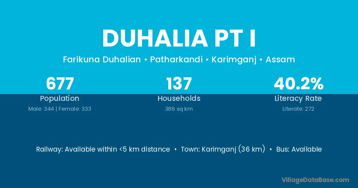 Karimganj (36 km) is the nearest town to Duhalia Pt I village for major economic activities and is located approximately 36 km away.