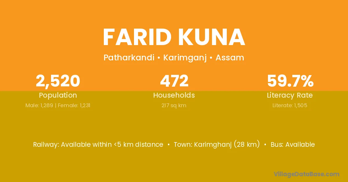 Karimghanj (28 km) is the nearest town to Farid Kuna village for major economic activities and is located approximately 28 km away.