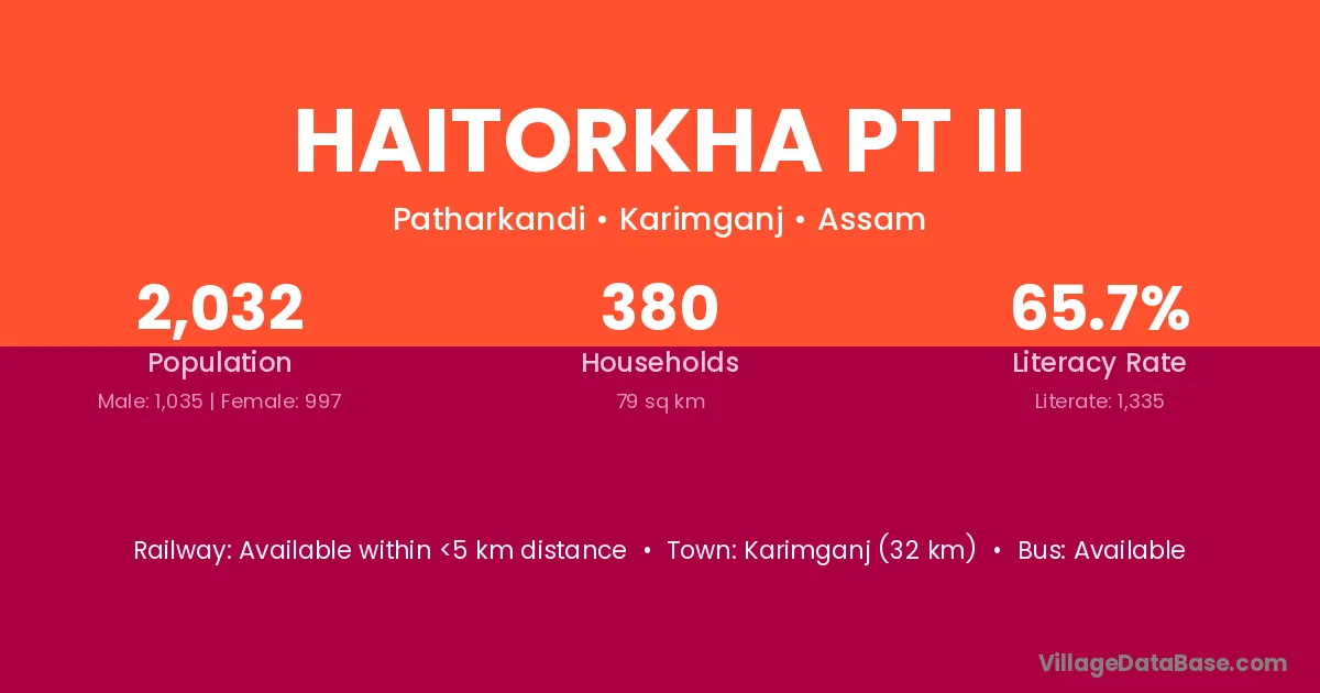 Karimganj (32 km) is the nearest town to Haitorkha Pt Ii village for major economic activities and is located approximately 32 km away.