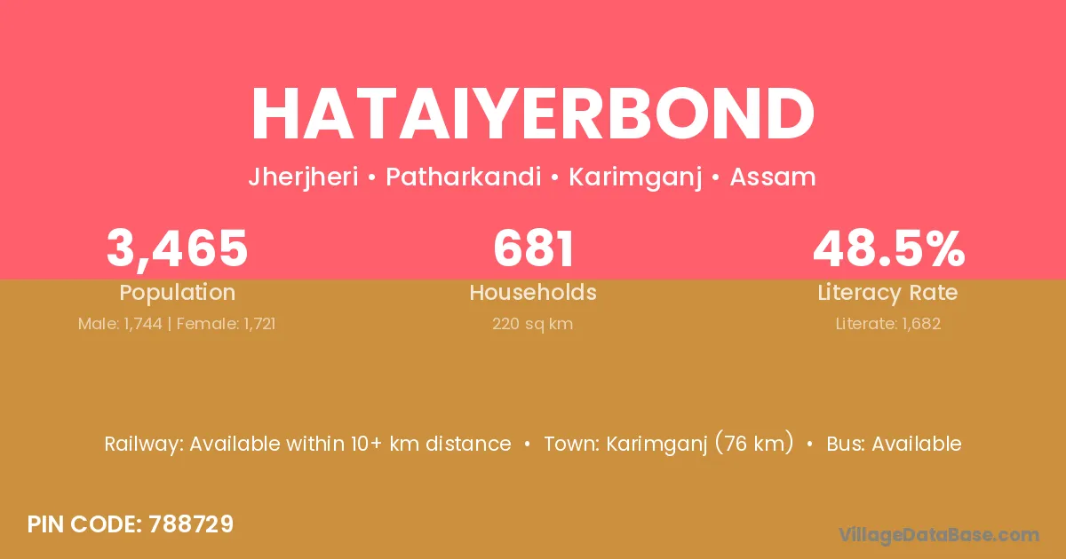 Hataiyerbond village has a total population of 3,465 people, of which 1,744 are males and 1,721 are females.