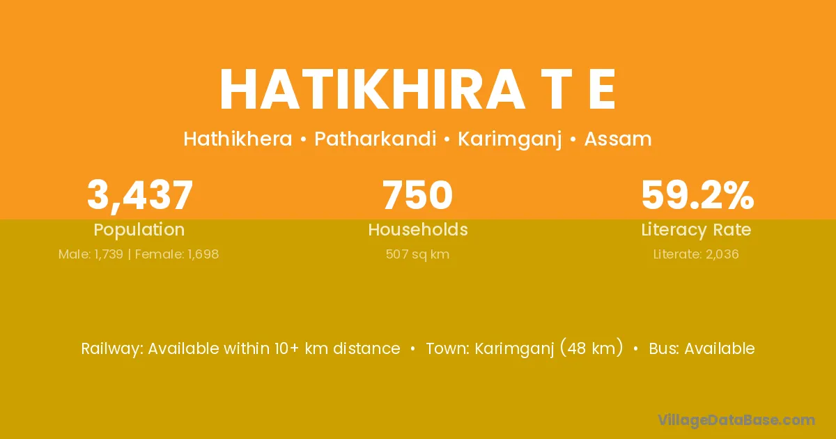 Karimganj (48 km) is the nearest town to Hatikhira T E village for major economic activities and is located approximately 48 km away.