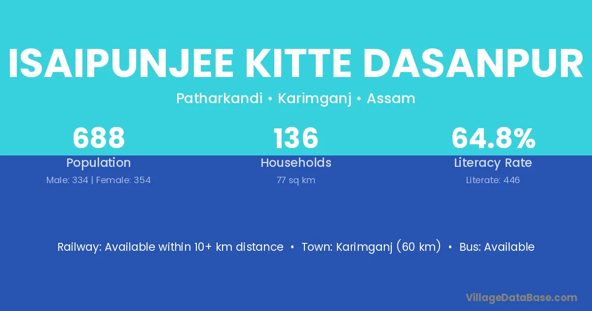 Karimganj (60 km) is the nearest town to Isaipunjee Kitte Dasanpur village for major economic activities and is located approximately 60 km away.