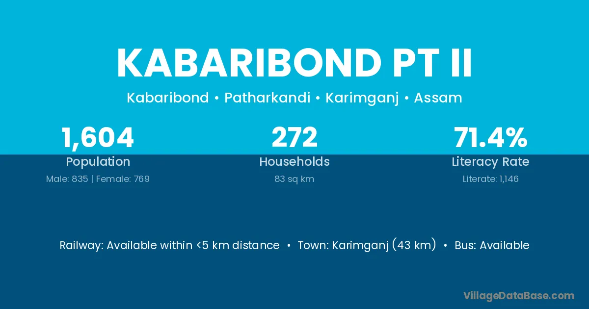 Karimganj (43 km) is the nearest town to Kabaribond Pt Ii village for major economic activities and is located approximately 43 km away.