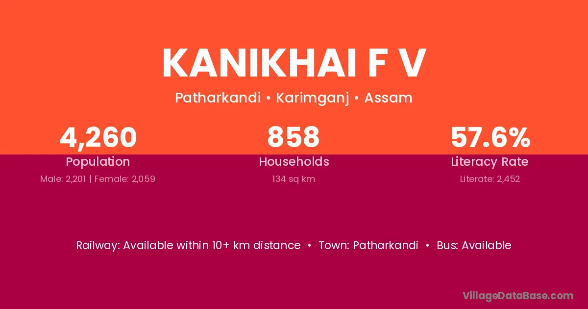 Kanikhai F V village has a total population of 4,260 people, of which 2,201 are males and 2,059 are females.