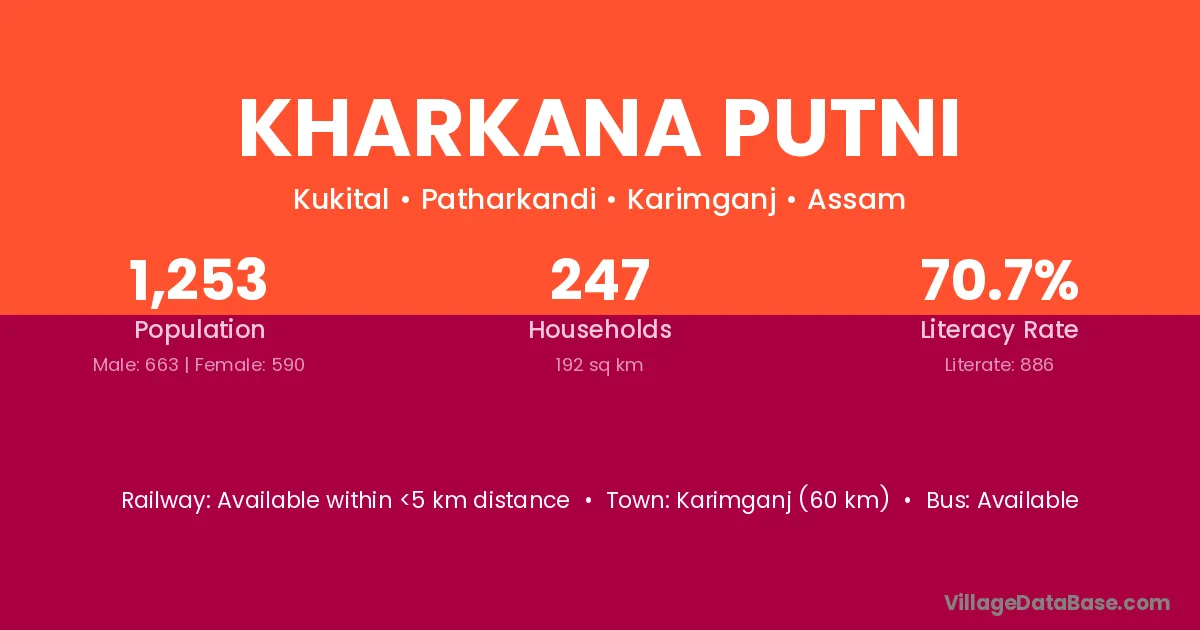 Karimganj (60 km) is the nearest town to Kharkana Putni village for major economic activities and is located approximately 60 km away.