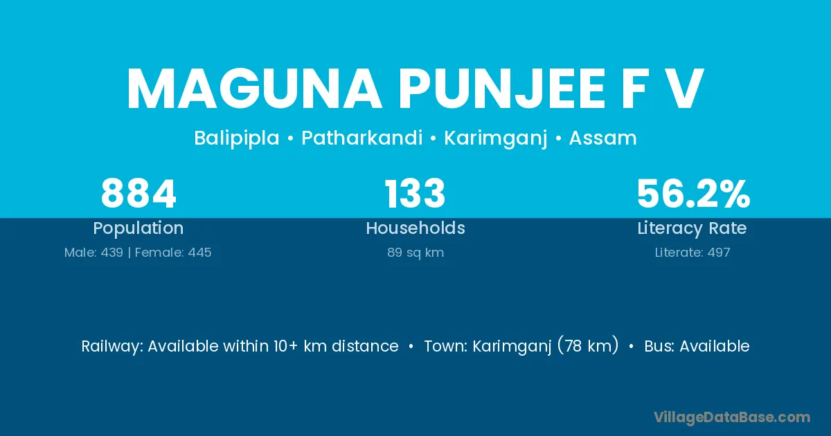 Maguna Punjee F V village has a total population of 884 people, of which 439 are males and 445 are females.