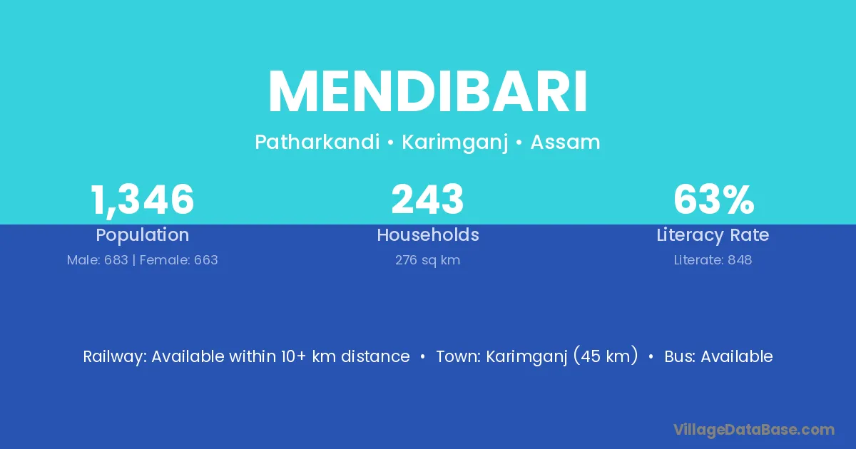 Karimganj (45 km) is the nearest town to Mendibari village for major economic activities and is located approximately 45 km away.