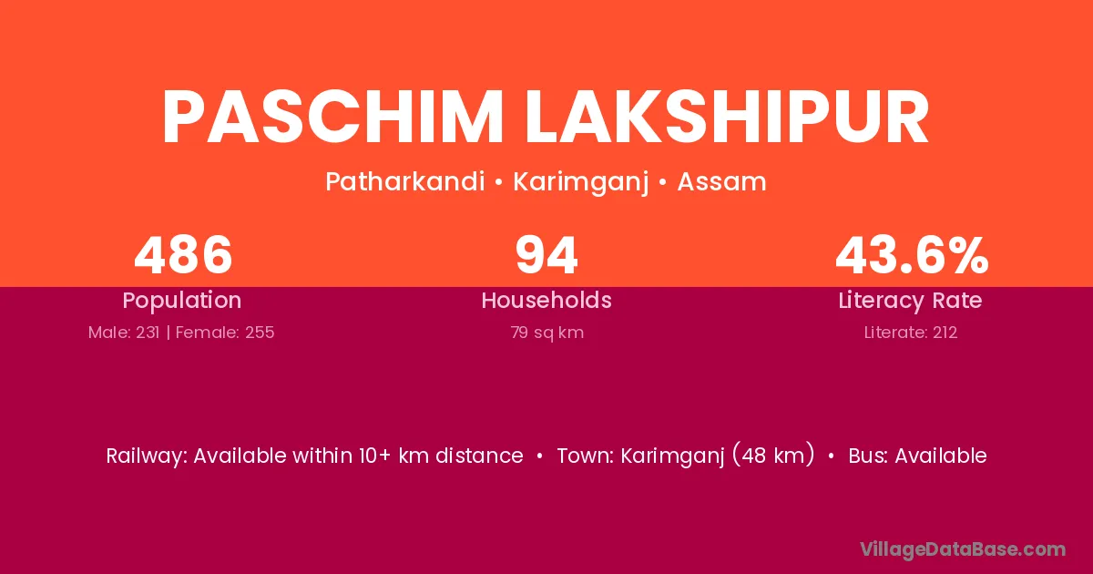 Paschim Lakshipur village has a total population of 486 people, of which 231 are males and 255 are females.