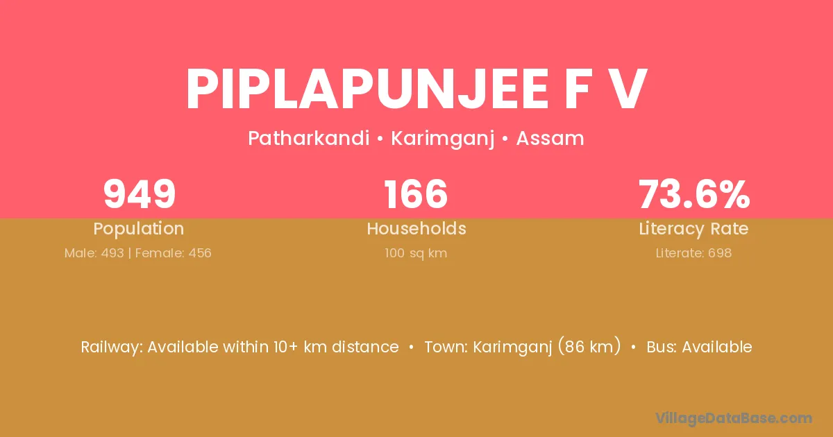 Karimganj (86 km) is the nearest town to Piplapunjee F V village for major economic activities and is located approximately 86 km away.