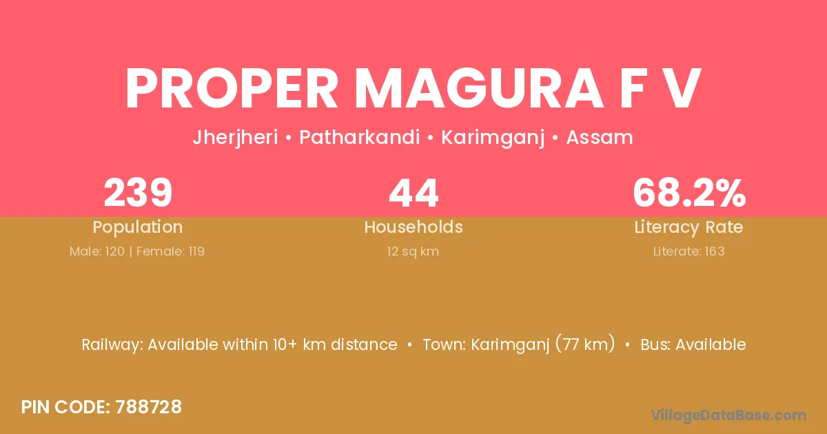Karimganj (77 km) is the nearest town to Proper Magura F V village for major economic activities and is located approximately 77 km away.