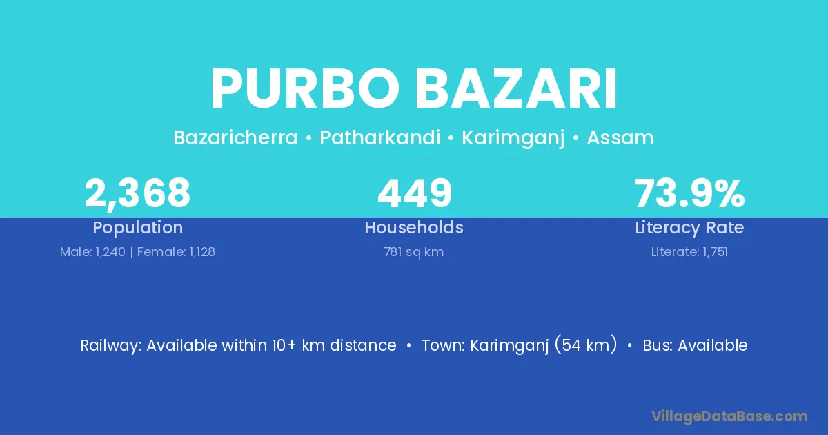 Karimganj (54 km) is the nearest town to Purbo Bazari village for major economic activities and is located approximately 54 km away.