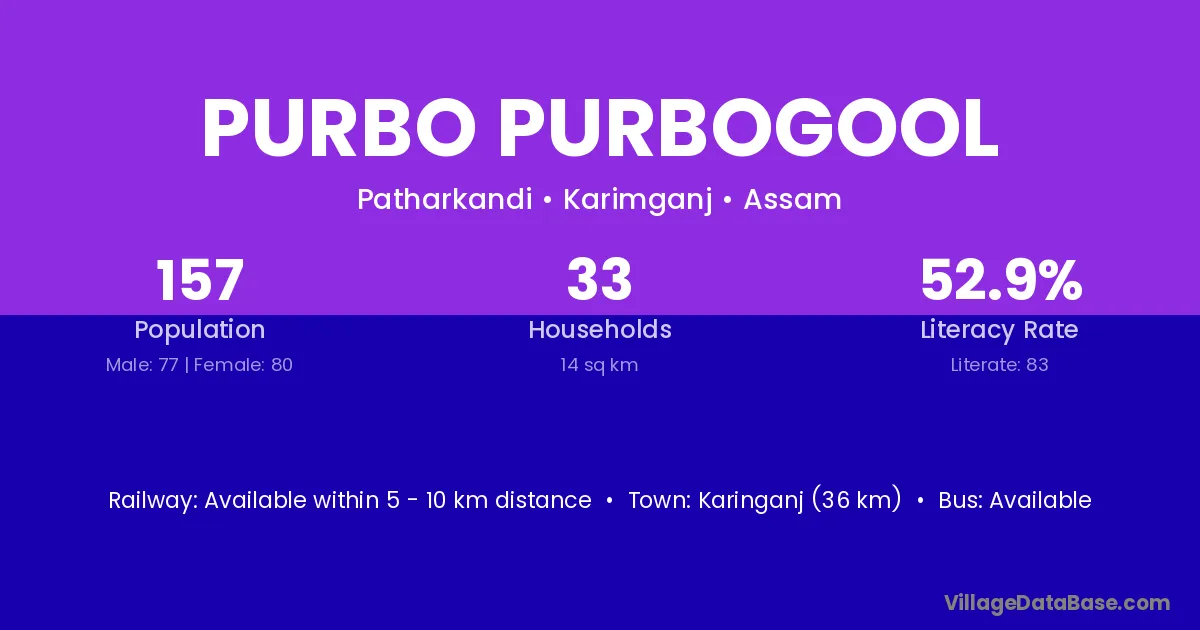 Purbo Purbogool village has a total population of 157 people, of which 77 are males and 80 are females.