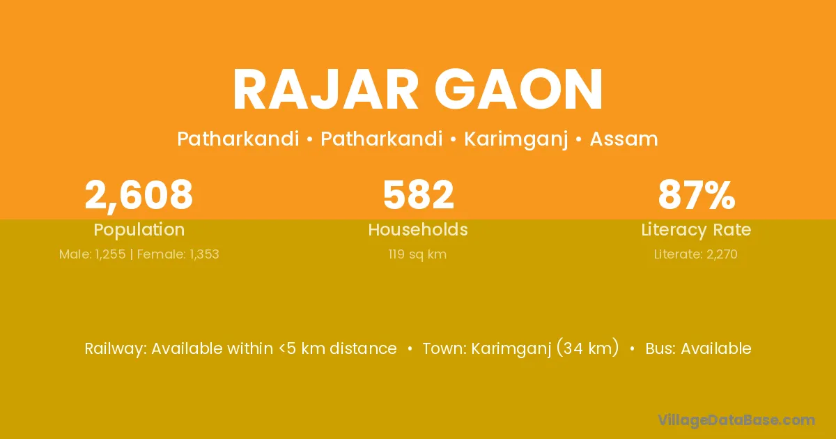 Karimganj (34 km) is the nearest town to Rajar Gaon village for major economic activities and is located approximately 34 km away.