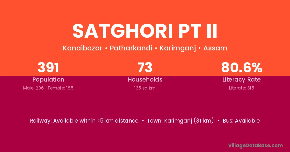 Karimganj (31 km) is the nearest town to Satghori Pt Ii village for major economic activities and is located approximately 31 km away.