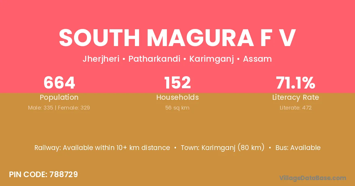 Karimganj (80 km) is the nearest town to South Magura F V village for major economic activities and is located approximately 80 km away.