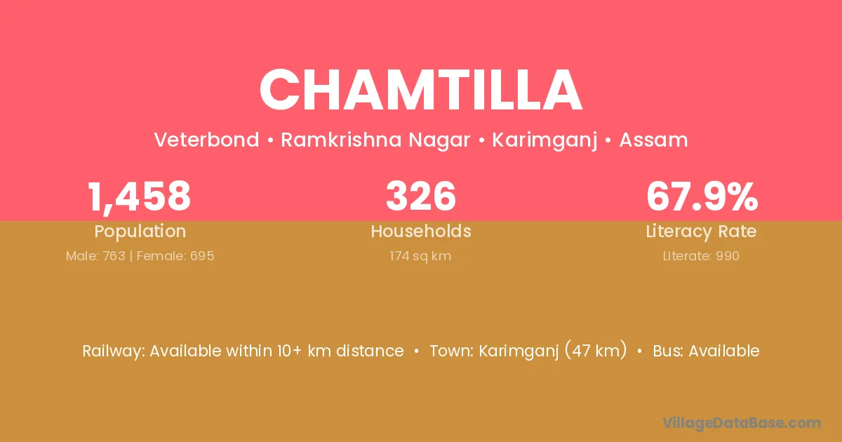 Karimganj (47 km) is the nearest town to Chamtilla village for major economic activities and is located approximately 47 km away.