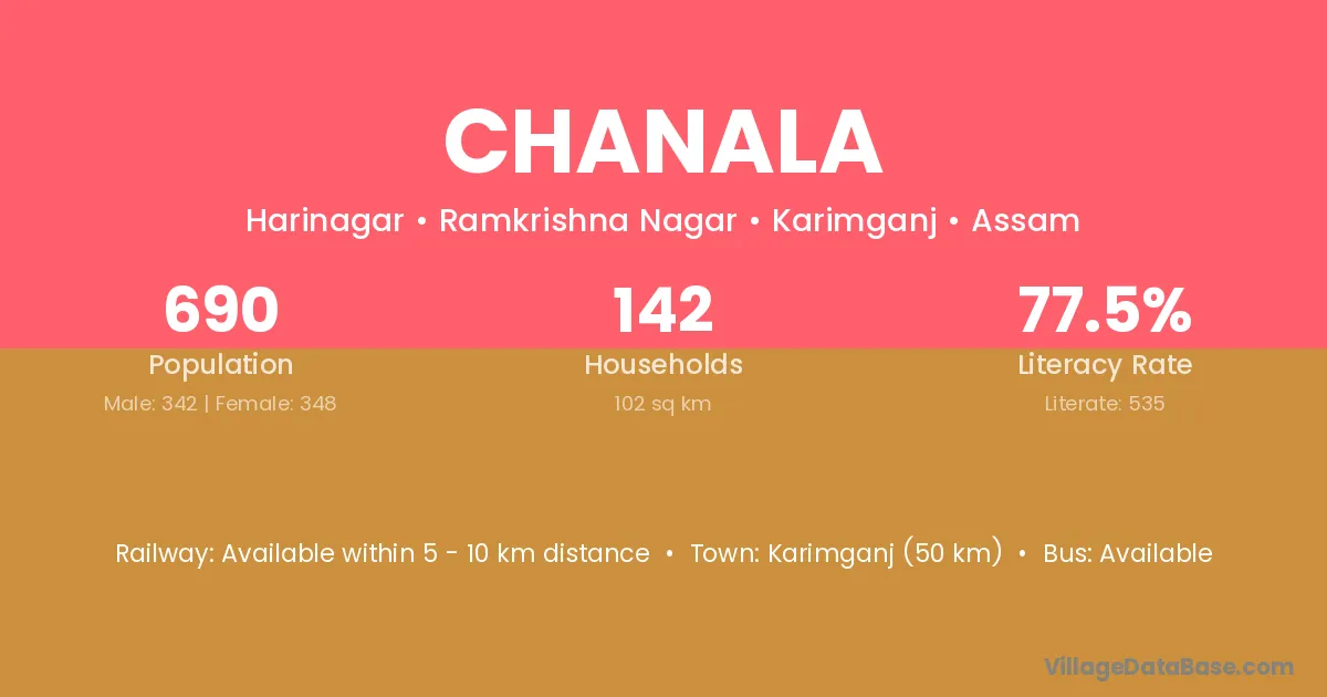 Karimganj (50 km) is the nearest town to Chanala village for major economic activities and is located approximately 50 km away.