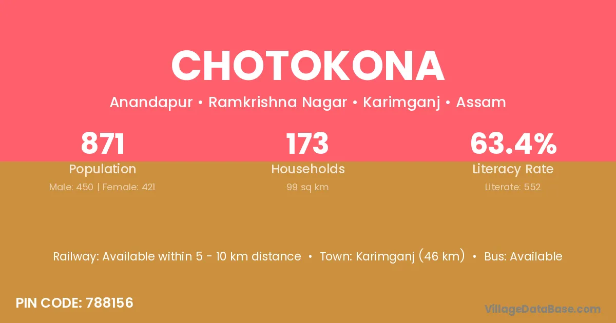 Karimganj (46 km) is the nearest town to Chotokona village for major economic activities and is located approximately 46 km away.