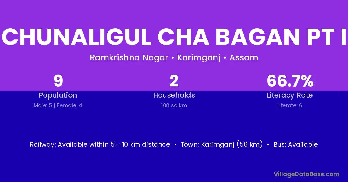 Karimganj (56 km) is the nearest town to Chunaligul Cha Bagan Pt I village for major economic activities and is located approximately 56 km away.