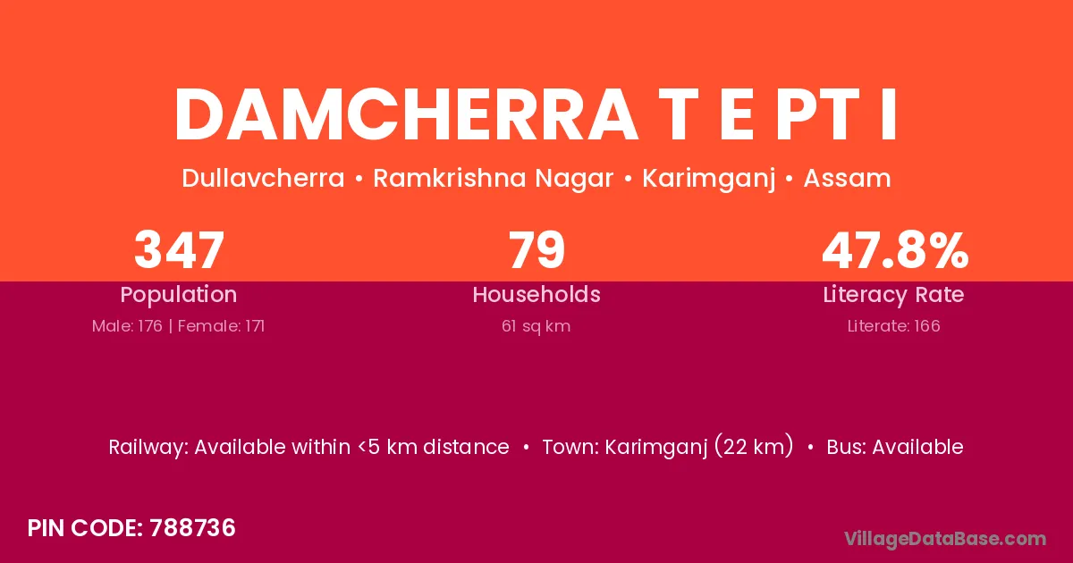 Karimganj (22 km) is the nearest town to Damcherra T E Pt I village for major economic activities and is located approximately 22 km away.