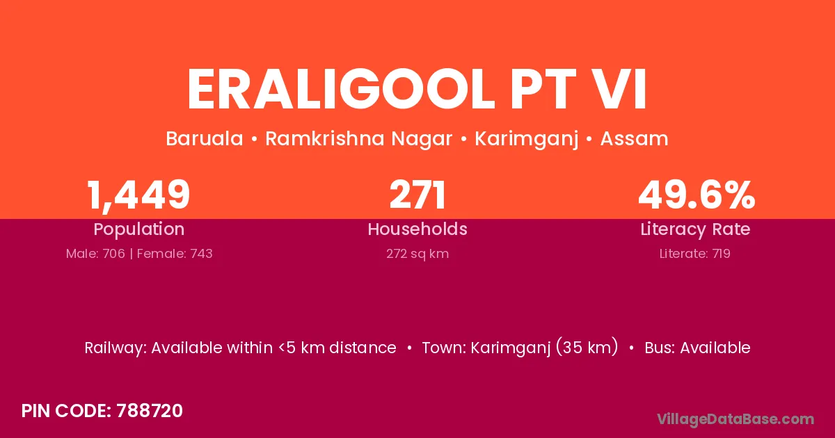 Karimganj (35 km) is the nearest town to Eraligool Pt Vi village for major economic activities and is located approximately 35 km away.