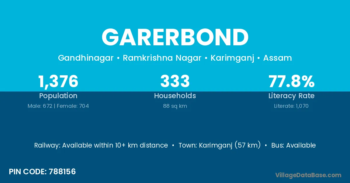 Karimganj (57 km) is the nearest town to Garerbond village for major economic activities and is located approximately 57 km away.