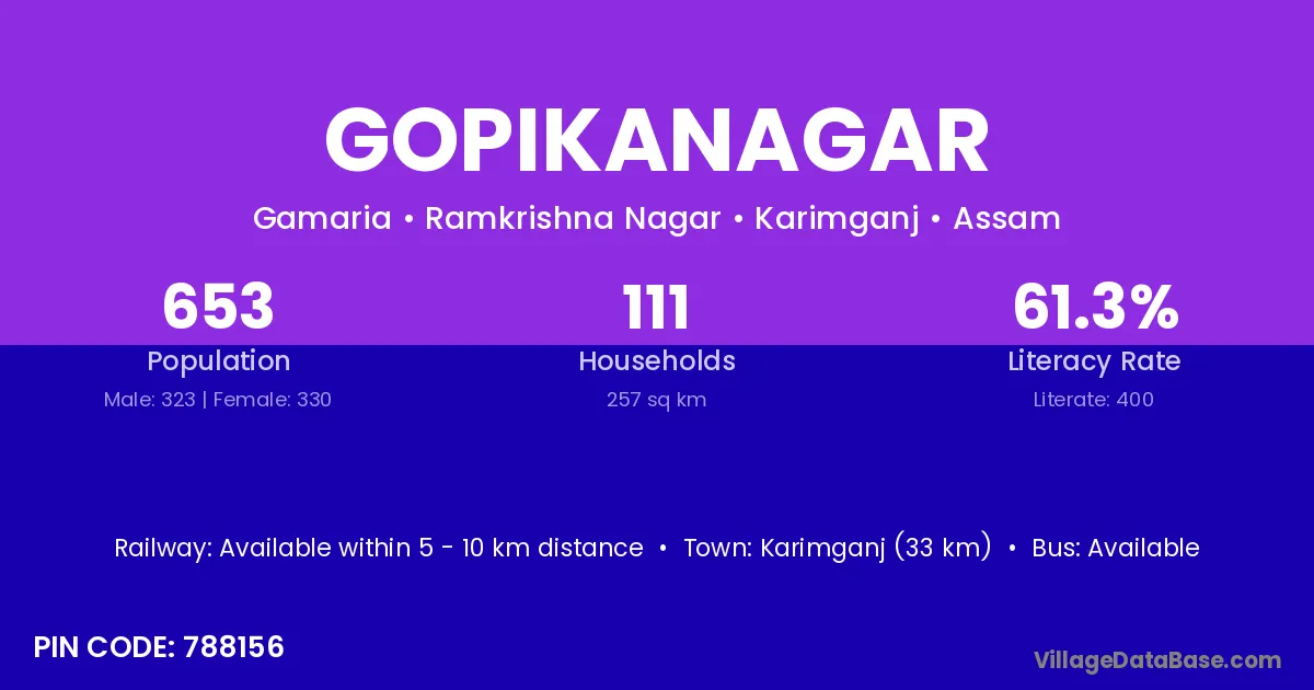 Karimganj (33 km) is the nearest town to Gopikanagar village for major economic activities and is located approximately 33 km away.