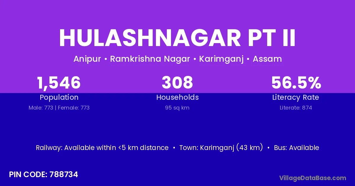 Hulashnagar Pt Ii village has a total population of 1,546 people, of which 773 are males and 773 are females.