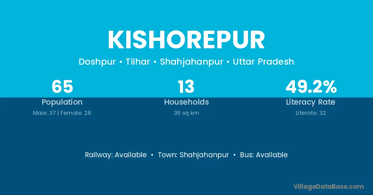 The literacy rate of Kishorepur village is 59.60%. Male literacy stands at 63.93% and female literacy at 54.97%.