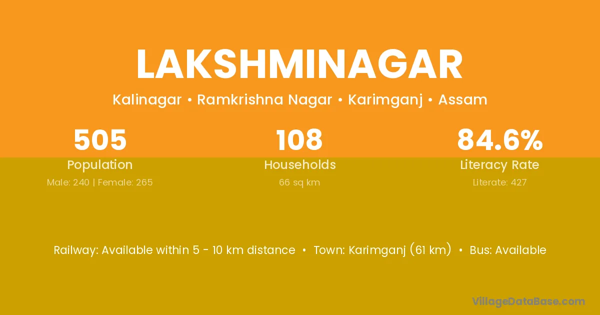 Karimganj (61 km) is the nearest town to Lakshminagar village for major economic activities and is located approximately 61 km away.