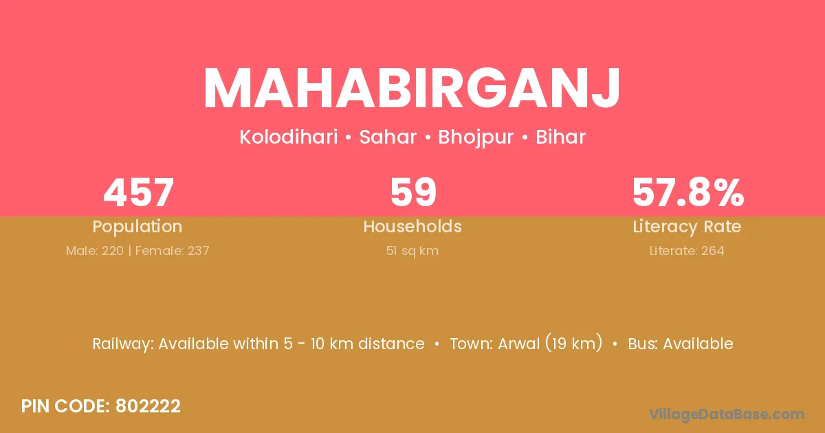 Karimganj (64 km) is the nearest town to Mahabirganj village for major economic activities and is located approximately 64 km away.