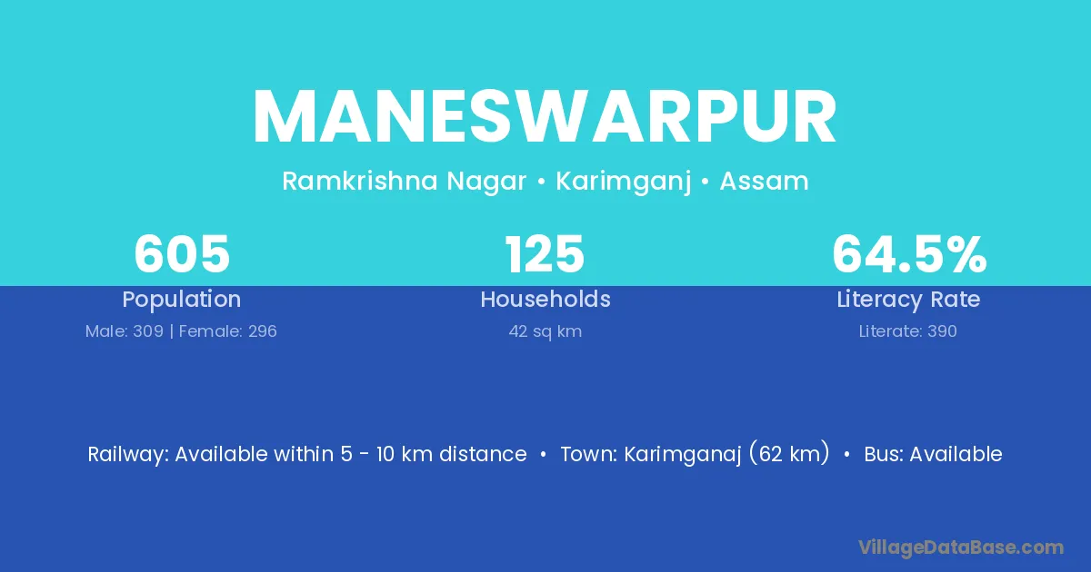 Karimganaj (62 km) is the nearest town to Maneswarpur village for major economic activities and is located approximately 62 km away.
