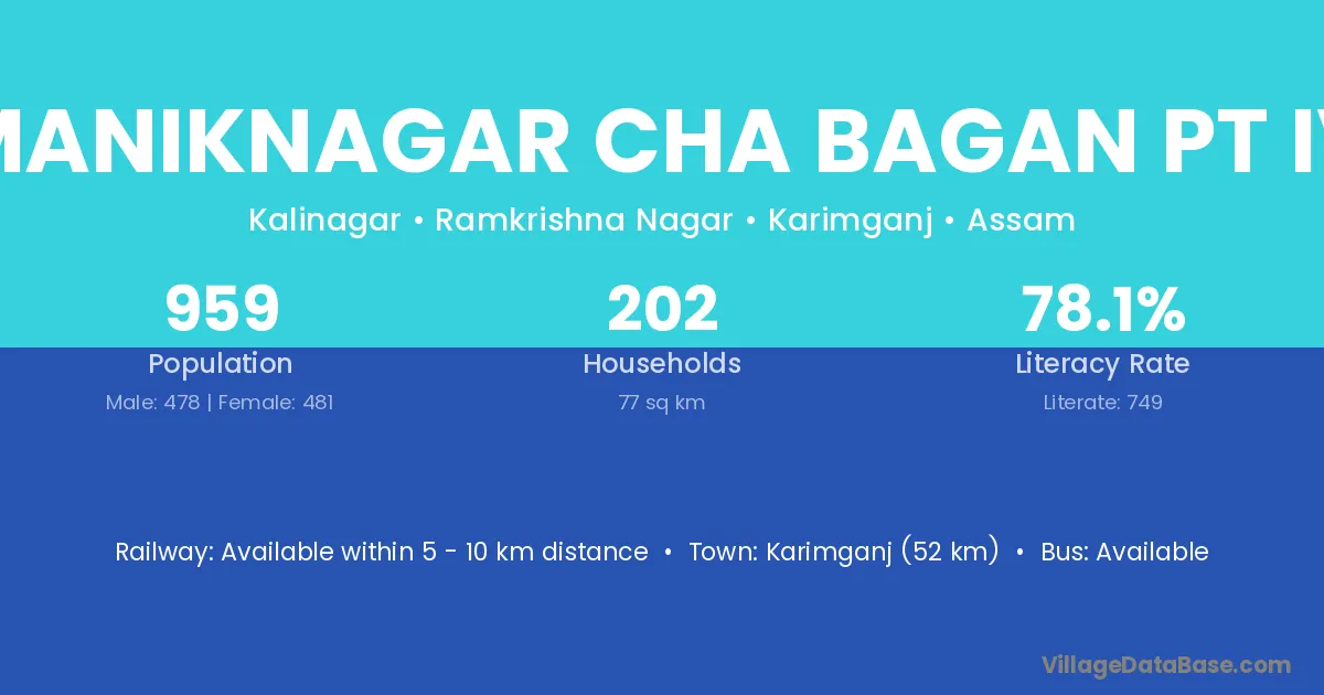Maniknagar Cha Bagan Pt Iv village has a total population of 959 people, of which 478 are males and 481 are females.