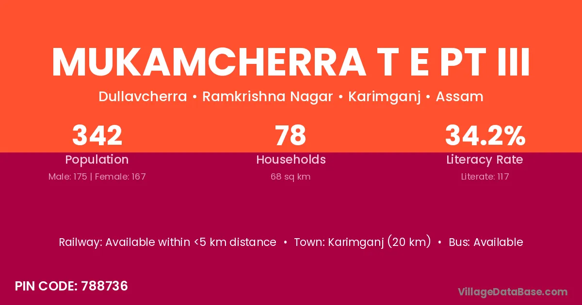 Karimganj (20 km) is the nearest town to Mukamcherra T E Pt Iii village for major economic activities and is located approximately 20 km away.