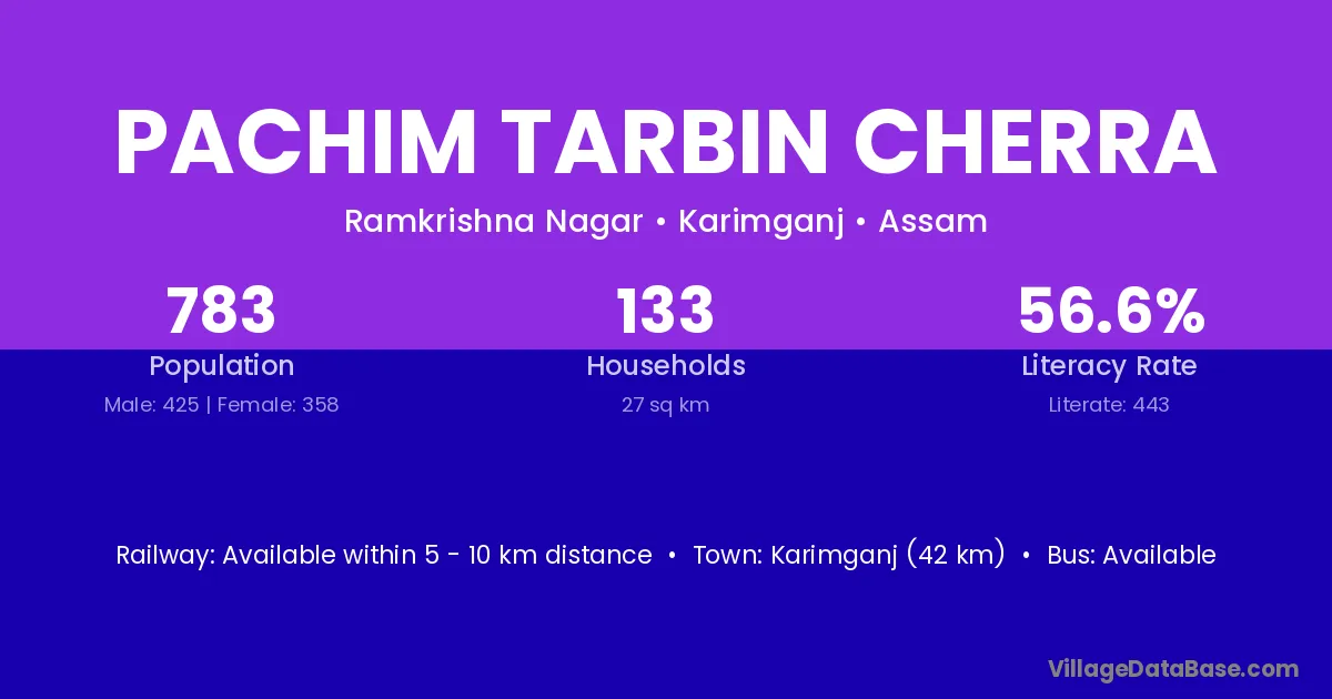 Karimganj (42 km) is the nearest town to Pachim Tarbin Cherra village for major economic activities and is located approximately 42 km away.