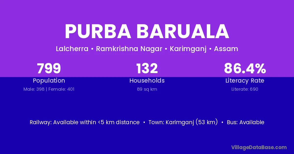 Karimganj (53 km) is the nearest town to Purba Baruala village for major economic activities and is located approximately 53 km away.