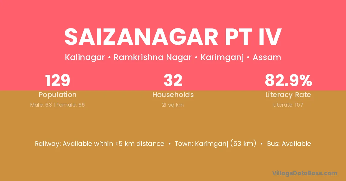 Karimganj (53 km) is the nearest town to Saizanagar Pt Iv village for major economic activities and is located approximately 53 km away.