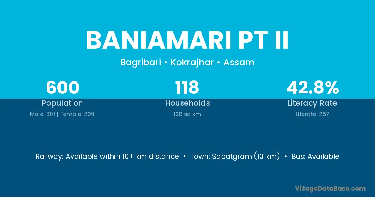 Sapatgram (13 km) is the nearest town to Baniamari Pt Ii village for major economic activities and is located approximately 13 km away.