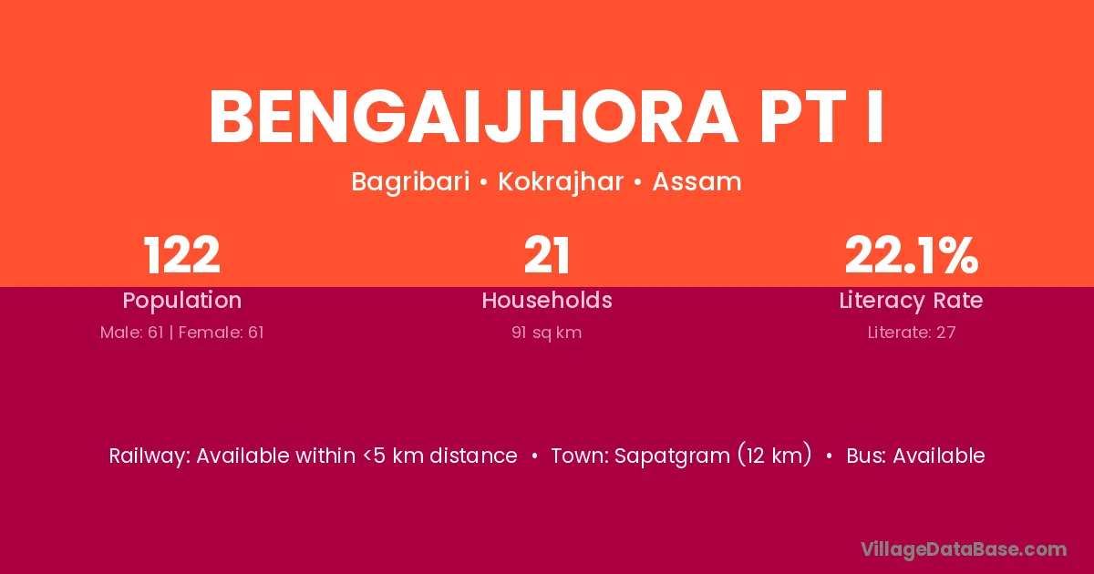 Bengaijhora Pt I village has a total population of 122 people, of which 61 are males and 61 are females.