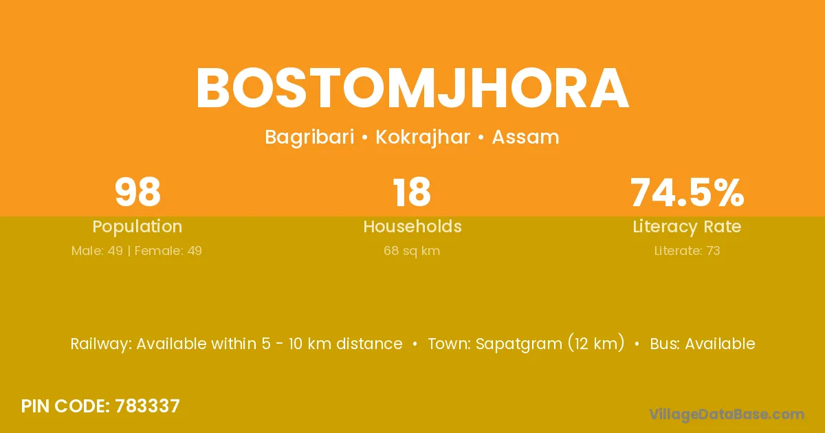 Sapatgram (12 km) is the nearest town to Bostomjhora village for major economic activities and is located approximately 12 km away.