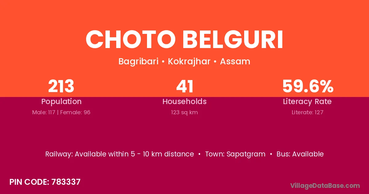 Choto Belguri village has a total population of 213 people, of which 117 are males and 96 are females.