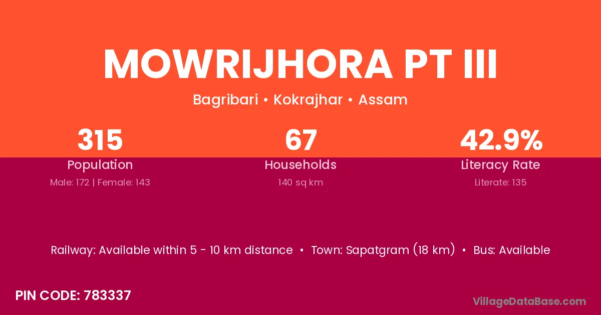 Mowrijhora Pt Iii village has a total population of 315 people, of which 172 are males and 143 are females.