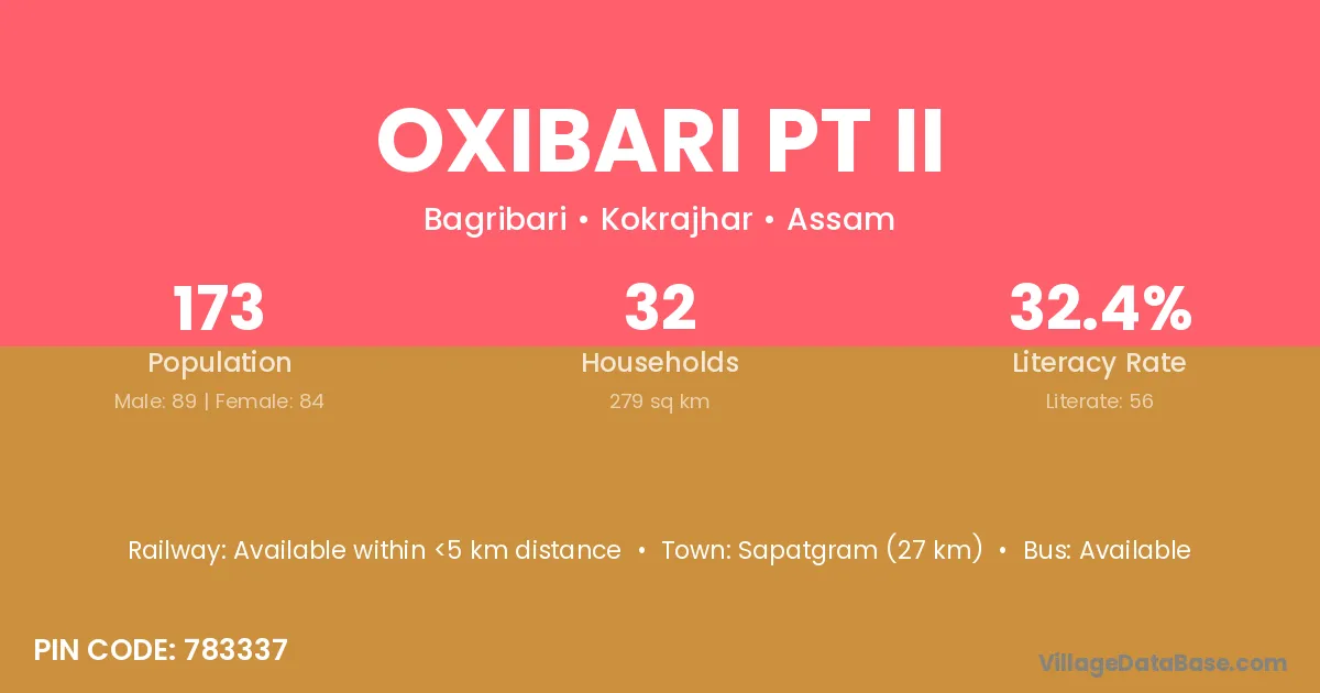 Sapatgram (27 km) is the nearest town to Oxibari Pt Ii village for major economic activities and is located approximately 27 km away.